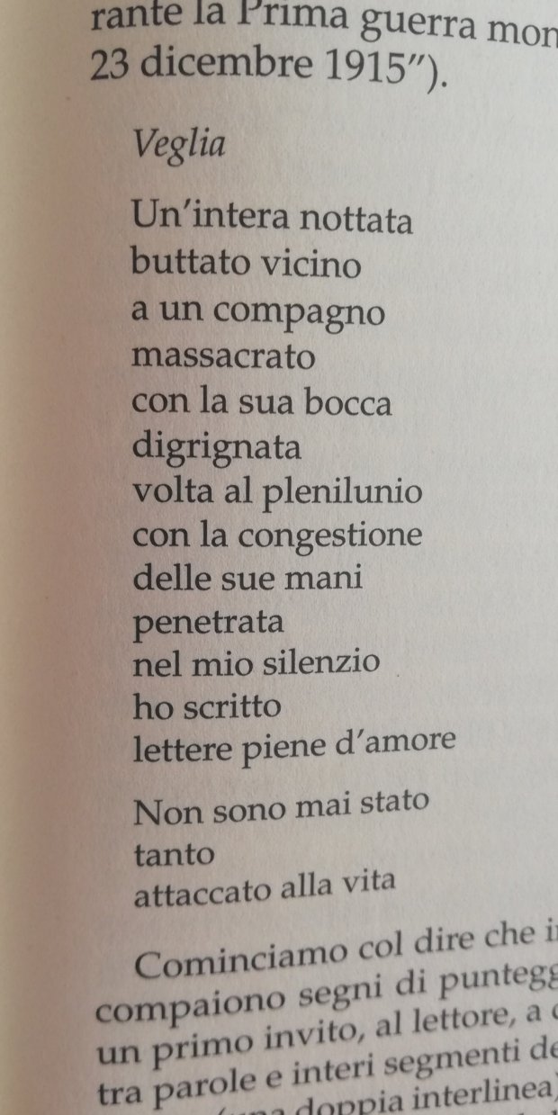 Io però la ripropongo qui perché è una poesia di cui non posso ignorare la profondità psicologica: il poeta è in guerra ed è in una fossa accanto al cadavere di un suo compagno e condivide con lui l’esperienza della sua morte. Ciò fa nascere in lui un fortissimo sentimento di attaccamento alla vita.